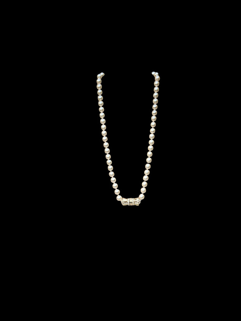 Vintage 1980s Kenneth Jay Lane (KJL) faux pearl necklace.  24" long. Clasp is a gold tone and rhinestone snap.  Faux pearls are a warm white with knots between each 10mm pearl.  All pearls are the same size and color.