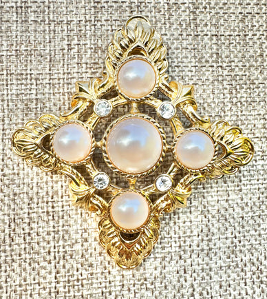 Vintage Kenneth Jay Lane (KJL) signed gold tone faux pearl crystal stone brooch.  Fleur de lis branch pin.  2.75"x2.75"